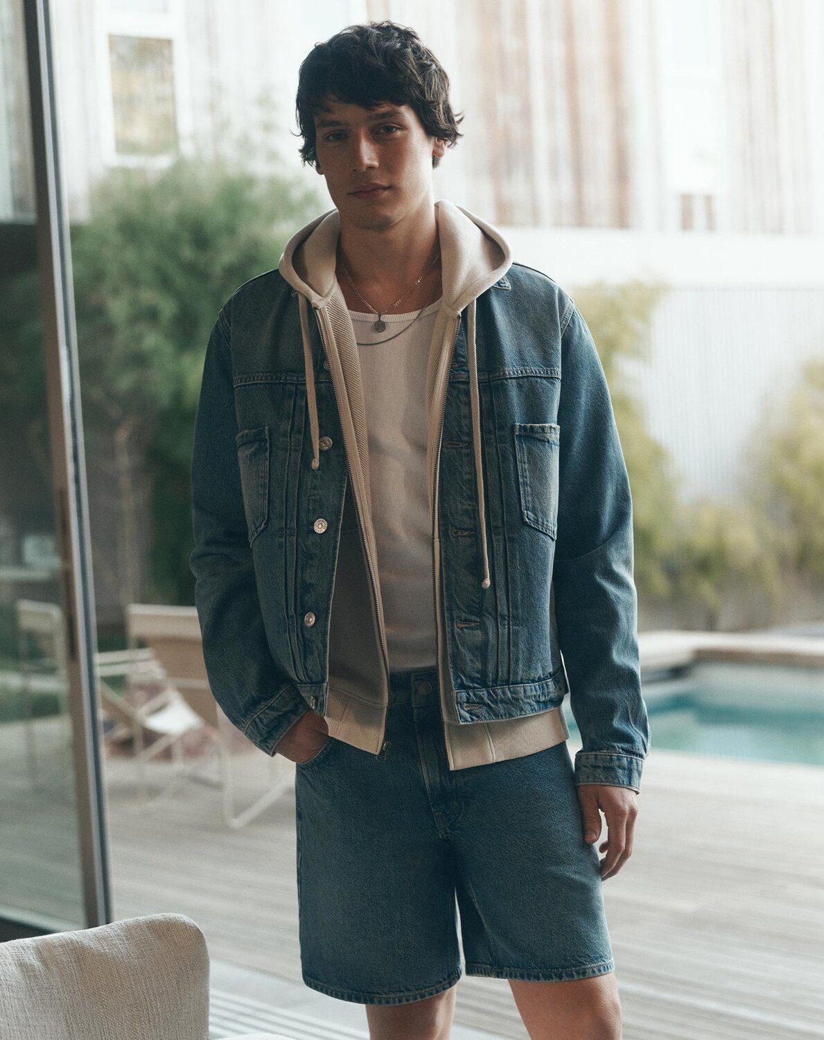 Featuring the Darnell Short in Scooter worn with the Sorden Tee in White, Avon Hoodie in Washed Vanilla Bean and Tobin Jacket in Scooter.